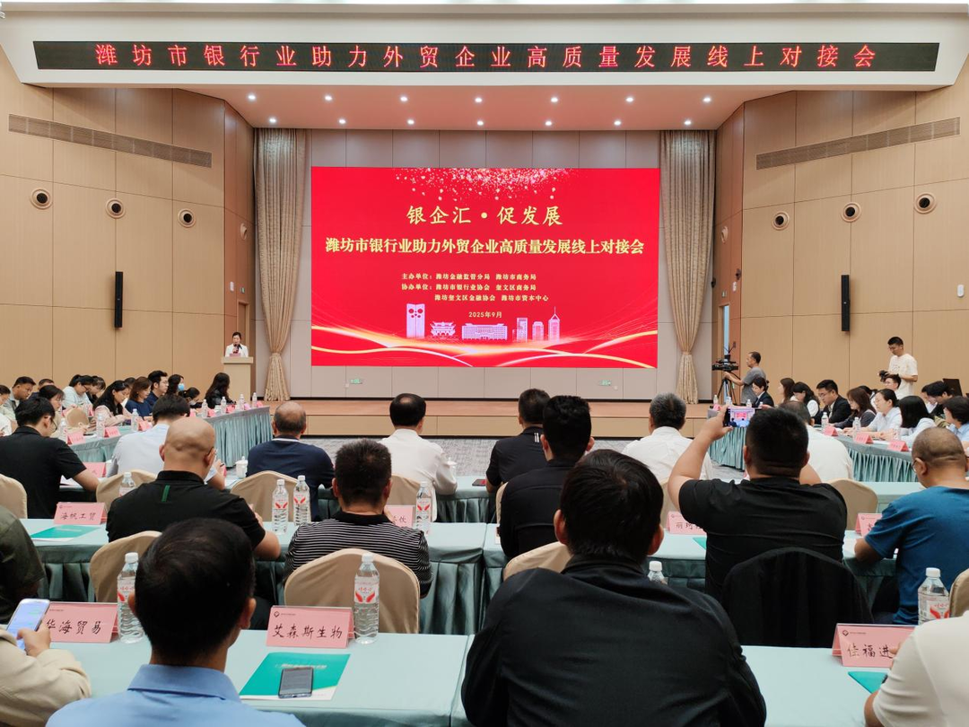 9月25日,由潍坊金融监管分局、潍坊市商务局主办,潍坊市银行业协会、潍坊奎文区金融协会、奎文区商务局、潍坊市资本中心承办的潍坊市银行业助力外贸企业高质量发展线上对接会在潍坊市资本中心举行。